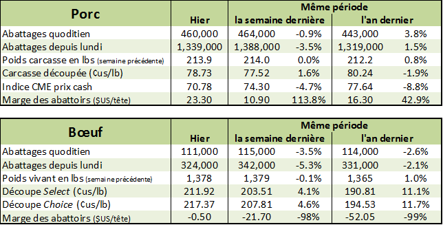 Les négociants ont remarqué que les spéculateurs ont liquidé des positions hier à mesure que le marché poussait sous les niveaux atteints vendredi. Le marché s’est négocié aussi à la limite de -3¢ bas pour avril avant de rebondir. Ces derniers jours, le prix du bétail négocié au Kansas et au Texas était à 128¢, en baisse de 2¢ sur la semaine dernière. Le département agricole des É-U (USDA) estimait que les abattages étaient de 111 000 têtes hier, amenant le total pour la semaine à 324 000, en baisse par rapport à la semaine dernier (342 000) et par rapport à l’an dernier (329 000). Le prix des découpes Select étaient en hausse de 1.45¢, à 217.37¢ à la fermeture.