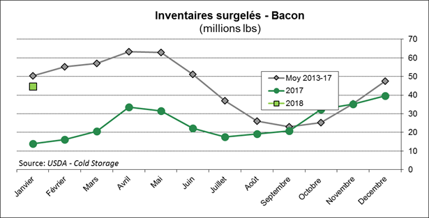 - Inventaires surgelés de porc à 568 M lbs, soit 16% et 8% de plus qu’en décembre et l’an dernier respectivement