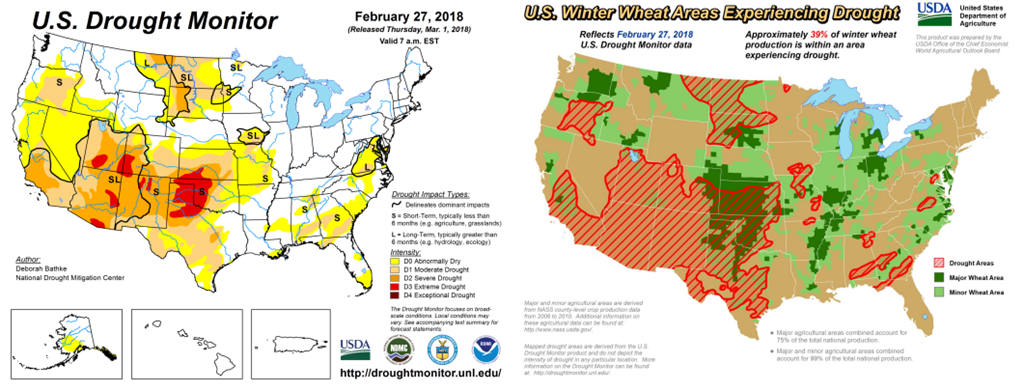 Le marché du blé a connu une hausse plus importante alors que les fonds continuent de couvrir les shorts à Chicago tout en construisant des positions longues à KC, car les cartes météorologiques restent très sèches pour les régions de blé d’hiver au cours des 10 prochains jours. La carte mise à jour de la sécheresse aux États-Unis montre aujourd'hui la sécheresse croissante dans les zones du sud-ouest des États-Unis (voir ci-dessous). Le blé Mpls continuera également à attirer plus d'acres ce printemps.