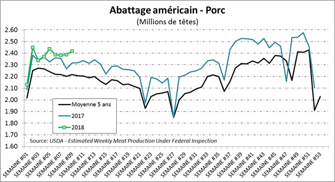 La semaine dernière, les abattages de porcs étaient de 2.42 millions têtes, en hausse de 4.4% par rapport la même semaine en 2017. C’est le plus important volume en 4 semaines ce qui est inhabituel puisqu’on devrait observer le début de la baisse saisonnière de la production. De plus, le poids se maintient tout juste en-dessous de 214 lbs/carcasse, représentant 1.3 lbs de plus que l’an dernier. En somme, la production totalise plus de 516 millions lbs ce qui est 5.0% de plus que l’an dernier. Pour le 1er trimestre de l’année, la production américaine fût de 4.55 milliards lbs, soit 2.8% de plus que l’an dernier ce qui est très près des prévisions de l’USDA à +2.9%.