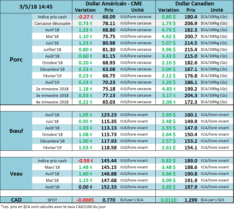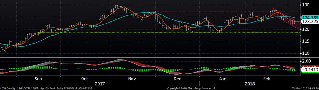 Suite au rapport Cattle-on-Feed de la semaine dernière dévoilant plus de bœufs en parc qu’anticipés, le prix du bœuf a continué sa tendance baissière la semaine dernière. On observe un petit rebond aujourd’hui, en hausse de 1¢/lb sur avril. Malgré ce rebond, il est encore trop tôt pour dire que le prix a changé sa tendance alors que le prix de vendredi avait clôturé à son plus bas niveau en 6 semaines. Les ventes négociées sur les plaines américaines étaient entre 126 – 127.50 ¢/lb, principalement à 127 ¢/lb ce qui représente une diminution de 1¢ par rapport la semaine précédente. Les acheteurs (abattoirs) devraient rester patients au courant des prochaines semaines sous l’appréhension d’un prix cash qui reculera en raison de l’énorme production à venir.