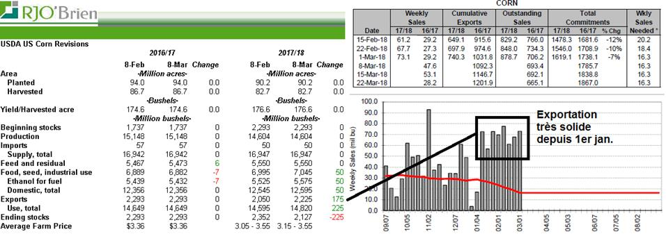 La force de l’exportation depuis le début de l’année a poussé le gouvernement américain à augmenter la cible d’exportation de 175 millions de boisseaux. C’est énorme, et plus que prévu. En fait ils l’avaient aussi augmenté solidement le mois passé et donc l’augmentation est de 300 millions de boisseaux depuis février. Le massif retard de l’automne est en train de s’effacer pas à peu près. Ce me rappelle la remontée des Canadien contre les Rangers il y a une couple d’année (Mon dieu je pense que ça fait 10 ans! On vieillit). L’exportation est extrêmement solide car 1) seul les américain ont du corn à vendre actuellement 2) les prix étaient relativement faible cet hiver pour favoriser l’utilisation et 3) il est fort probable que le Brésil/Argentine en récolte moins cette année. Bref c’est comme ma femme qui achète 10 canne de soupe Campbell quand ils sont en spécial en me disant « Ca s’perd pas tsé ». Elle a absolument raison, merci Chérie. D’ailleurs l’USDA a été très (très, TRÈS) généreuse dans son évaluation de la récolte Brésilienne de maïs car la mini révision à 94.5 millions de tonnes est loin de celle de CONAB (l’équivalent du USDA au Brésil, disons) est à 87 million de tonnes. En combinant Argentine et Brésil il m’apparait possible que les inventaires de l’Amérique du sud soit 8-10 millions de tonnes surévaluée par l’USDA. Si c’est le cas, la forte exportation qu’on a depuis le début de l’année risque de se poursuivre et ce sur la prochaine récolte 2018/19 car cela va prendre un an avant que l’Argentine/Brésil ne revienne sur le marché d’export (je calcul printemps 2019, s’ils ont une bonne récolte).
