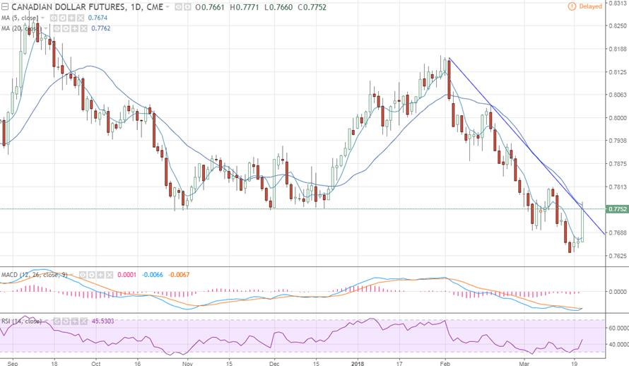 Résultats des courses, lumière d’espoir pour l’ALÉNA et politiques monétaire accommodante aux States donne du gaz au dollar canadien. L’analyse graphique tourne positive, les lignes de tendance les indicateurs aussi. Prudence.