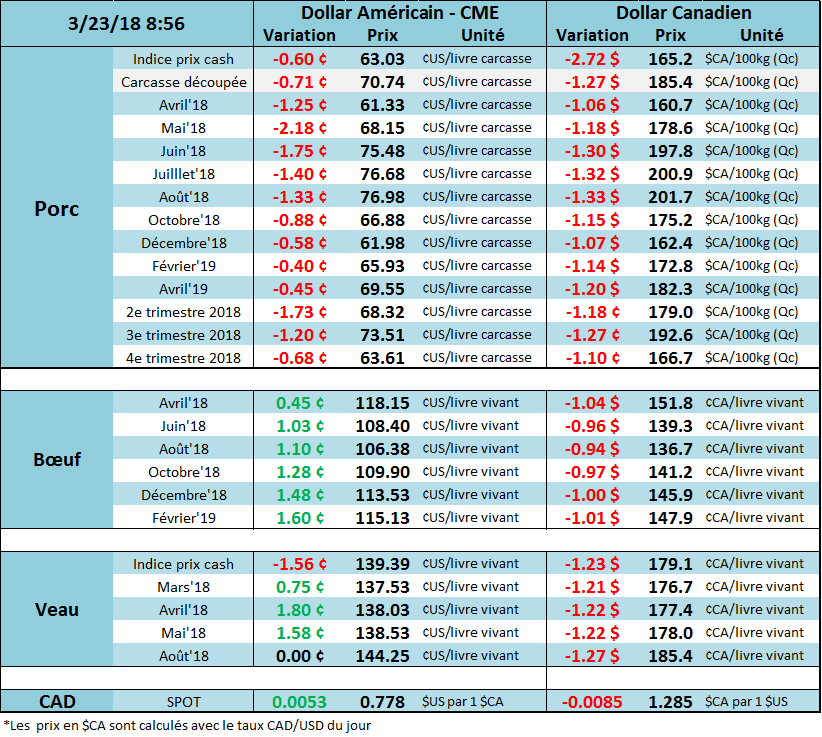Le marché du porc a sévèrement chuté hier sous la crainte que la Chine impose des représailles aux États-Unis après que les importations chinoises soient clairement ciblées par Trump. Hier, les prix d’avril, juin et juillet baissent de -1.25¢, -1.75¢ et -1.40¢. La mauvaise nouvelle est que la Chine a riposté cette nuit et imposera des tarifs de 25% sur quelques biens américains…. dont le porc! En fait, quelques aliments américains seront taxés par la Chine à 15% (fruits, noix, vins et alcool dénaturé) alors que le porc et l’aluminium recyclé seront taxés à 25%. En 2017, la Chine et Hong-Kong ont acheté 12.5% des exportations américaines. Inévitablement, le marché du porc risque de réagir négativement à cette nouvelle, on s’attend à ce que l’ouverture d’aujourd’hui ce fasse à la baisse. Apparemment, le marché du porc n’a pas encore atteint son creux avec ces mauvaises nouvelles.
