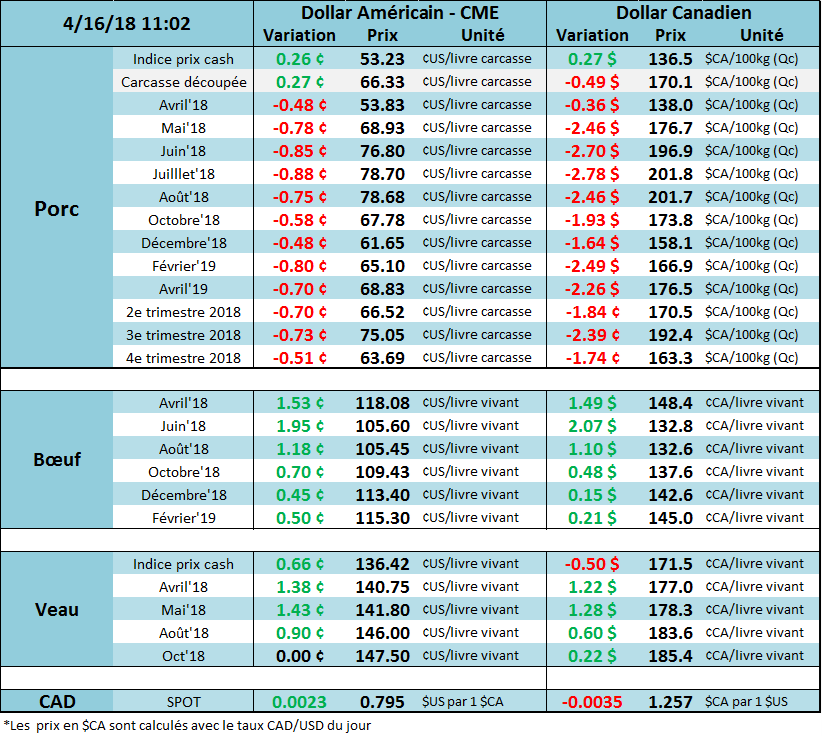 Le marché du bœuf rebondi fortement ce matin, en hausse de +2 ¢/lb sur juin, après que l’USDA ait répertorié des ventes cash à 120 ¢ au Kansas et Nebraska vendredi après-midi, même que certaines ventes ont atteint 122 ¢ au Nebraska. Le prix du bœuf demeurera sous pression à cause d’une hausse de production de 10% attendue au second trimestre. Ce vendredi, l’USDA publiera son rapport Cattle-on-Feed, les estimés du rapport seront publiés au cours de la semaine.