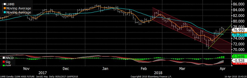 Le porc de juin a terminé la semaine à 77.65¢/lb vendredi, comparativement à 73.28¢/lb pour la fermeture de la semaine précédente, un rebond de 4.37¢/lb en une semaine. Le renversement a été alimenté par la diminution des tensions commerciales entre les États-Unis et la Chine et le récent rebond du prix cash qui semble avoir trouvé un creux au milieu de la semaine, à 52.97 ¢/lb sur l’indice CME. La montée saisonnière des prix sur les contrats d’été est probablement déjà inclus dans le prix des contrats, avec juin se transigeant à +23.5 ¢/lb du prix cash. Il faudra donc une forte augmentation des prix cash et de la patience au cours des prochaines semaines pour briser la résistance à 79-80¢/lb. Dans le même ordre d’idée, le marché recul légèrement ce matin.