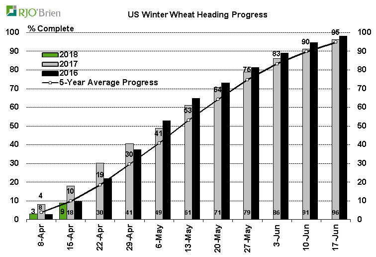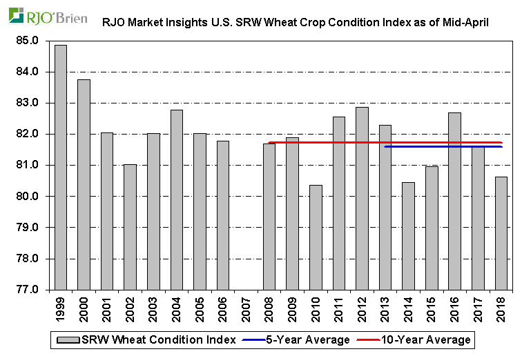 Début de semaine difficile pour le CBOT, principalement plombé par les prix du blé. Les forecast météo nous montrent de la pluie dans les régions sèches de blé d’hiver. Je pense que le marché fait l’argument que la pluie annoncé est plus bénéfique pour le blé que néfaste pour les semis de maïs (retard). Je suis d’accord. Le blé à 30% de bonne excellente condition a vraiment besoin d’une gorgée d’eau. C’est plus important que semé du maïs en avril. À priori il n’aura pas beaucoup de champ ensemencé au 1er mai, peut-être qu’à ce moment les investisseurs/utilisateurs commenceront à s’ajuster. Comme vous le voyez sur les cartes plus bas, à ce temps ci (mi-avril) c’est juste un départ et à peine 5% des surfaces de corn sont semé. Pas de panique. Dans le blé printemps ce n’est pas l’idéal non plus, juste 3% quand on s’attend à 15% et aussi on prévoit une augmentation de près de 1 millions d’acres cette année. Vont-ils y arriver? Vu qu’on est encore « de bonne heure » je pense que la bourse s’en préoccupe moins, mais plus le temps avance plus il faudra y faire attention.