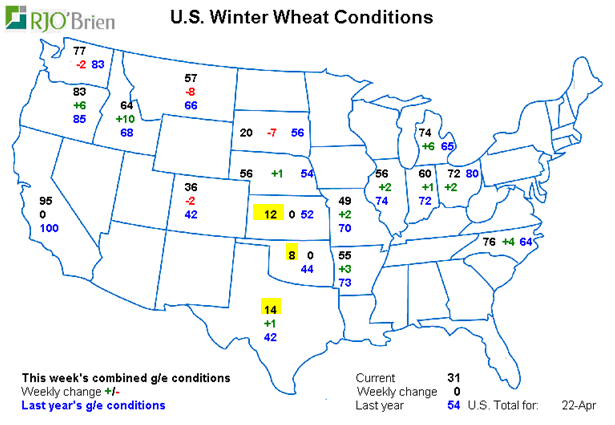 Blé d’hiver : La condition du blé ne s’améliore pas alors que la récolte américaine entre dans le stade d’épiaison. Déjà 13% du blé d’hiver est en épiaison ce qui est en retard versus l’an dernier (30%) et la moyenne quinquennale (19%). En ce qui concerne la condition de la culture, on est encore à 31% bon/excellent contrairement aux attentes qui étaient à 32%. On note que la condition des régions du blé de Chicago (Soft Red Winter Wheat) s’est améliorée tandis que les régions pour le blé de Kansas City (Hard Red Winter Wheat) ne se sont pas amélioré, même qu’elles demeurent très mauvaise avec seulement 8% et 12% de bon/excellent au Nebraska et Kansas respectivement. L’an dernier, la condition du blé d’hiver était à 54% bon/excellent.