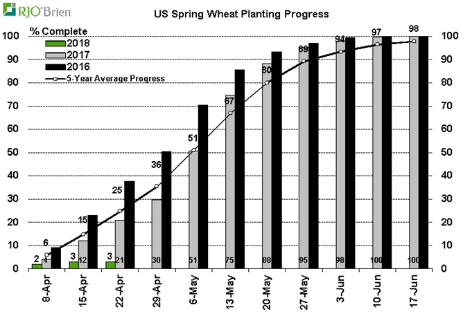 - Blé de printemps : 3% de planté vs attentes à 7% (fourchette 5 à 10%); 3% la semaine dernière; 21% l’an dernier; 25% en moyenne