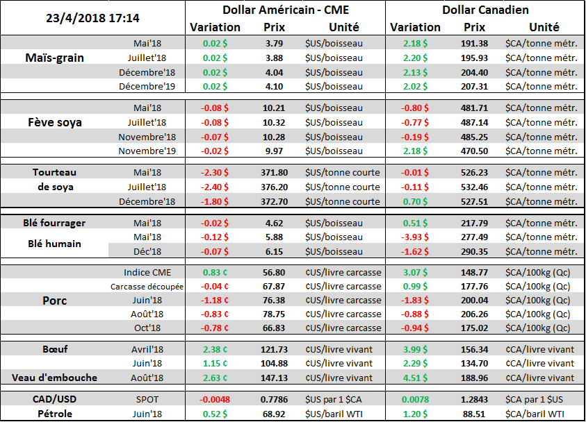 Maïs : Les États du sud ont réussi à avancer les semis de maïs contrairement au cœur du Cornbelt où les progressions sont assez minces. Même qu’au nord du Kansas/Missouri, il y a pratiquement rien d’ensemencé ce qui affiche un retard de 10 à 15% des surfaces versus la normale. Pour l’ensemble des États-Unis, on parle de 5% des surfaces d’ensemencées ce qui est moindre qu’attendues, c’est seulement 2% de plus que la semaine dernière… L’an dernier, à pareille date, nous étions à 15% de complété. Le gros du travail reste à faire au cours des 5 prochaines semaines et il faudra de belles semaines de temps sec afin de rattraper ce 8 millions d’acres de retard.