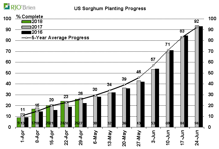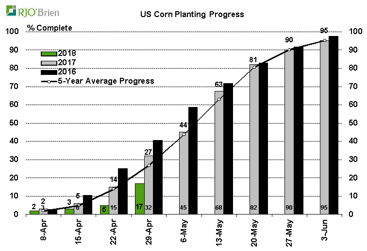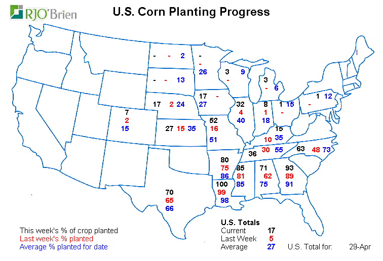 - Maïs américain : 17% de planté vs attentes à 18% ; 5% la semaine dernière; 32% l’an dernier; 27% en moyenne