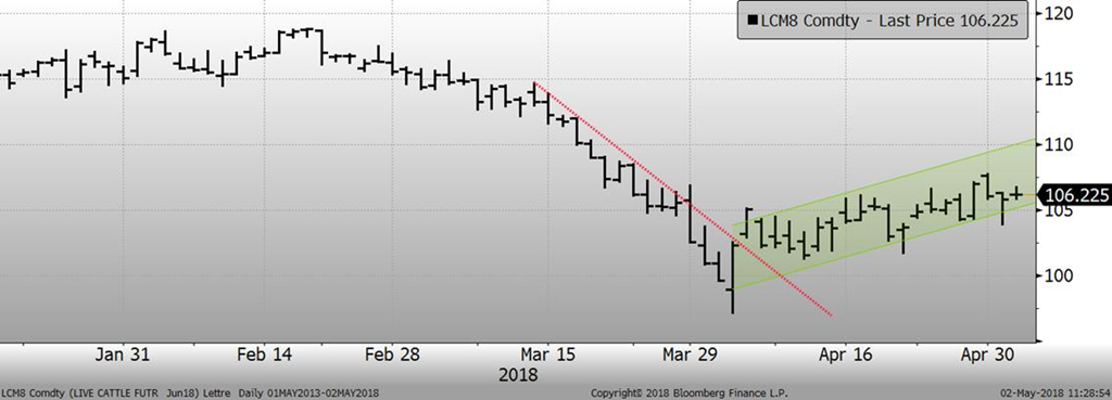Le prix cash du bœuf a explosé au cours des dernières semaines pour atteindre un niveau seulement atteint à la fin de juin l’an dernier. Le prix cash continue de bénéficier d’un niveau relativement faible d’abattages et d’une demande soutenue. Hier, les CàT de juin et août perdaient 0.45¢/lb et 0.37¢/lb, à 104.08¢/lb et 107.08¢/lb respectivement. Les parcs offrent les bœufs à 126 ¢/lb ce qui serait environ 4¢ de plus que la semaine dernière, mais aucune vente n’a été faite à ces prix. C’est dire que la différence entre le bœuf de juin et le prix cash demeure tout de même élevée. Cela devrait supporter la valeur du contrat de juin à court terme, en attendant cette hausse tant attendue de la production au 2e trimestre. Le danger est que l’augmentation de production qu’on n’observe pas en ce moment, expliquant le prix cash élevé, se retrouve condenser en mai-juin ce qui causerait une importante production. C’est ce qui explique la faiblesse de juin à court terme.