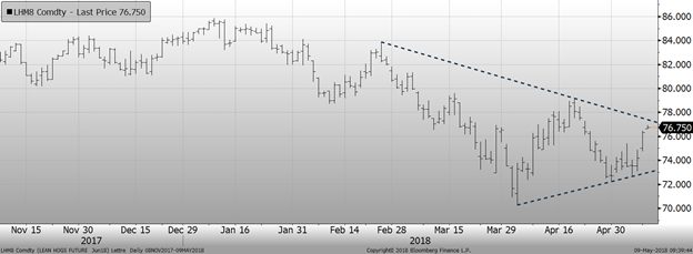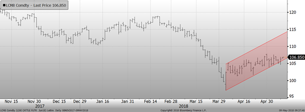 Le bœuf de juin clôturait en hausse de 1.12¢/lb hier, à 106.93¢/lb. Il semble que le marché anticipe maintenant que les effets de l’abondance de l’offre prévue se feront davantage sentir après juin. Le contrat d’août, à 104.48¢/lb, se maintient en dessous des niveaux de juin et d’octobre. Malgré une différence importante entre le bœuf de juin et le prix cash, celui-ci demeure tout de même élevé et continue de supporter le CàT de juin. Le prix cash continue de bénéficier d’un niveau relativement faible d’abattages et d’une demande soutenue. Le danger est le bœuf soit envoyé à l’abattoir au même moment, ce qui pourrait entrainer une dégringolade du prix cash et entraîner les contrats à termes pour les mois d’été dans son sillage.