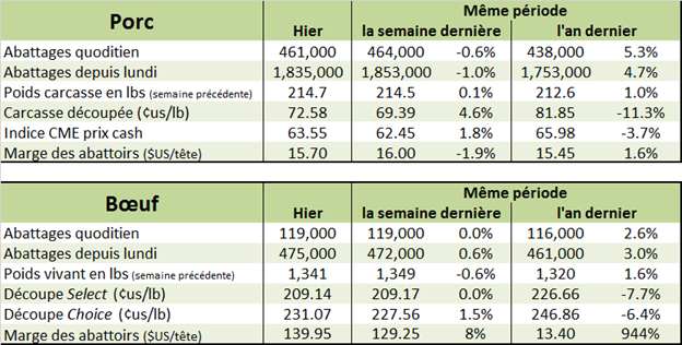 Dans le rapport Offre et Demande de l’USDA (WASDE), les prévisions de production ont été revues à la baisse pour le 2ème trimestre de 305M lbs. La production du 3e trimestre a également été diminuée par 90 M lbs. Cela dit, les fondamentaux demeurent négatifs à court terme dans le bœuf, car la production devrait tout de même augmenter de 5.4% au cours du 2e trimestre. Cette semaine, les abattages cumulés sont estimés à 475 000 têtes, en hausse de 9 000 bœufs versus l’an dernier (+1.9%). Le marché est donc toujours dans l’attente de cette offre additionnelle.