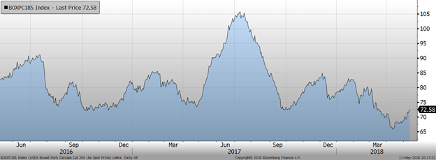 Je pense que c’est possible d’être optimiste pour un nouveau rallye de printemps pour les prix cash. Lorsque les grillades BBQ vont se mettre en place, cela devrait aider les valeurs des longes. C'est tempéré par les poids des bêtes encore 2.1 livres plus lourd qu'il y a un an alors que les packers ralentissent sur l’abattage. Je pense qu’il y a un potentiel haussier sur le prix cash (saisonnier). Les futures de juin arrivent à grand pas et l’écart entre le cash et juin est encore à près de 11 cents bien dessous des moyenne pour la mi-mai. Il va falloir que le cash monte rapidement afin de supporter les contrats de juin. La zone Iowa/Minnesota tire le cash encore à la baisse avec un escompte de 1-2$ sur l’indice.