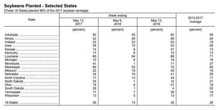 - Soya américain : 35% de planté ; 15% l’an dernier; 26% en moyenne