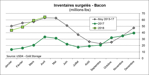 Selon le dernier rapport sur les inventaires surgelés, il y avait 9% plus de stock de porc qu’en avril 2017. Les inventaires de flanc sont particulièrement élevés comparativement à l’an dernier (+93% versus 2017), mais il s’agit d’une comparaison favorisée par des inventaires anormalement faibles l’an dernier. Pour ce qui est des retailles (+42% versus 2017), historiquement, les niveaux auraient dû commencer à diminuer. Cependant, c’est l’entrée en vigueur en avril des tarifs commerciaux de la Chine, plus grand importateur de retailles de porc américain, expliquant la hausse des stocks suite à la diminution des exportations américaines de retailles qui se sont accumulé dans les frigos.