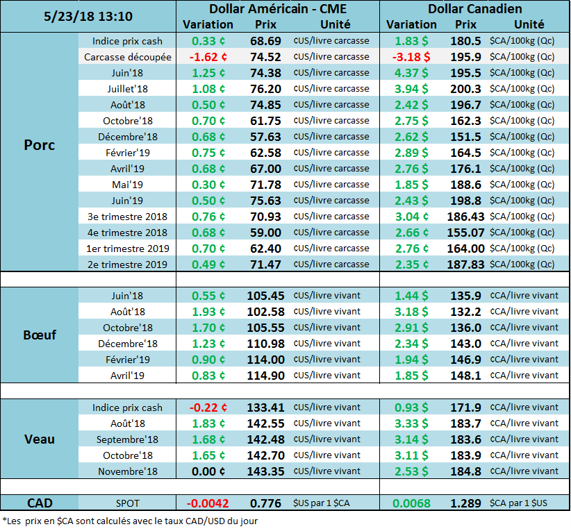 Le bas niveau de placement en avril doit toutefois être mis en contexte, car les placements à l’automne avaient été bien supérieurs aux moyennes historiques et précipités par la piètre qualité des pâturages l’automne dernier. Le cheptel demeurera toutefois très important pour les mois d’été, expliquant pourquoi les CàT d’août se maintiennent plus bas que juin et octobre. La demande devra être au rendez-vous sans quoi l’écart pourrait se creuser davantage entre août et octobre.
