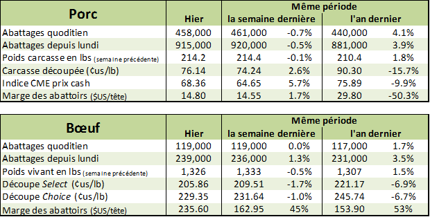 Mardi, les estimés d’abattages de l’USDA étaient de 458 000 têtes versus 461 000 têtes la semaine dernière. Cela porte le total pour le début de la semaine à 915 000 têtes, en baisse de 5000 têtes par rapport à la semaine dernière, mais en hausse de 4.0% comparativement à l’année dernière.
