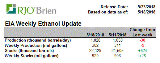 La semaine dernière, la production américaine d’éthanol était en baisse de 3.0% par rapport à la semaine précédente, mais demeurait 1.8% plus élevée que l’an dernier. Le rythme de production actuel est en ligne pour rencontrer les estimés d’utilisation annuelle de l’USDA, à 5.575 milliards de boisseaux de maïs. Malgré une hausse plus importante qu’attendue des inventaires, ceux-ci continuent d’être 2.3% plus bas qu’à la même date l’an dernier, à 22.13 millions de barils. Historiquement, avec l’arrivée des mois d’été occasionnant une augmentation de l’utilisation des automobiles, les inventaires prennent normalement une tendance baissière jusqu’au mois d’août. Un retour à une baisse des inventaires au cours des prochaines semaines ne serait donc pas surprenant.