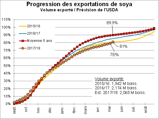 Pour le soya, il s’agissait de la 2e semaine d’annulation nette de ventes à l’exportation pour cette récolte, la dernière était à la mi-février. Malgré les annulations de la Chine (53,000 tonnes) et le déclin des achats, l’objectif d’exportation de l’USDA reste bel et bien envisageable. Contrairement à l’an dernier, le rythme de vente par semaine est inférieur à 4 millions de boisseaux d’ici la fin août versus des besoins de 6.5 million/semaine en 2017 pour atteint l’objectif de l’USDA. L’attention se porte désormais sur les livraisons, car celles-ci accusent encore un retard ce qui pose un risque d’annulation pour les prochaines semaines.