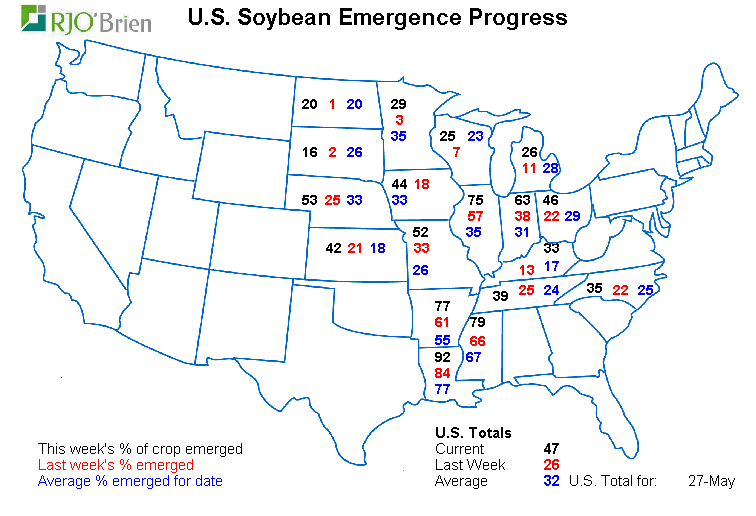 - Soya américain : 77% de planté ; 65% l’an dernier; 62% en moyenne