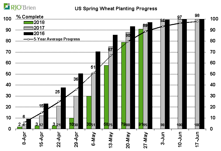- Blé de printemps : 91% de planté; 95% l’an dernier; 89% en moyenne