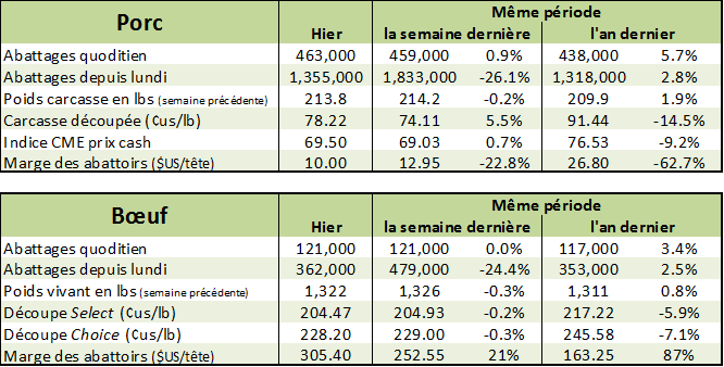 L’USDA estimait que les abattages étaient de 121 000 têtes hier, amenant le total de la semaine à 362 000 têtes. L’an dernier, les abattages étaient de 361 000 têtes pour la même période. Cette semaine, les abattages étaient en baisse suite au long weekend de Memorial Day.