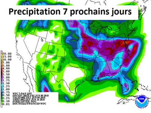 Coté Météo, encore une fois tout va bien. À court terme il y a chaleur et précipitations. La météo en juillet va être importante, certes, mais au moins à date il ne manque pas d’eau dans le cornbelt. Le forecast long terme est très beau aussi; pas de chaleur accablante et max très bonne probabilités de pluie. Rain makes corn (♪♪♪♪corn makes whiskey, whiskey makes my baby, feel a little frisky, Luke Bryan ♪♪♪♪)