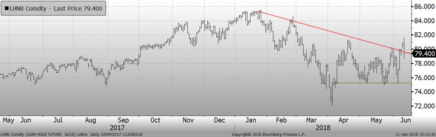 C’est l’attente d’une très forte progression de l’offre au 2e trimestre qui continuait de maintenir une pression sur le prix des contrats à terme d’été jusqu’à tout récemment. Il semble que cette augmentation ne s’est pas reflétée dans les statistiques d’abattages, ce qui a enlevé de la pression sur les prix la semaine dernière. L’USDA estimait que les abattages étaient de 658 000 têtes la semaine dernière, une hausse de seulement 3.5% par rapport à 2017. Cette hausse de la production de bœuf américain était la même (+3.5%) il y a deux semaines, ce qui est largement moins qu’initialement annoncé par L’USDA. Depuis le début de l’année, la production de bœuf gras est seulement 3.7% de plus que l’an dernier.