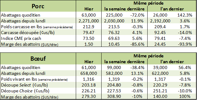 Le bœuf clôturait en hausse vendredi de +1.65¢/lb (juin), +1.62 (août) et +1.05¢/lb (octobre). Le bœuf de juin terminait la semaine à 110.03¢/lb. Vendredi, les négociations au Nebraska se concluaient autour de 115¢/lb, en hausse par rapport à 107-112¢/lb la semaine précédente. Malgré un petit recul, la force du prix des découpes est également un élément positif pour le marché puisque les marges des abattoirs se maintiennent à 280 $US/tête.
