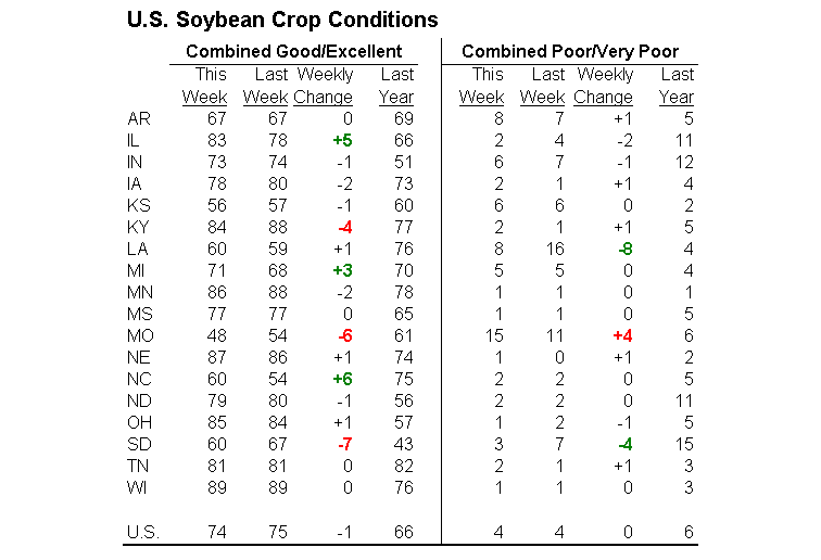 - Soya américain : Baisse de -1% à 74% bon/excellent vs 66% l’an dernier à pareille date.