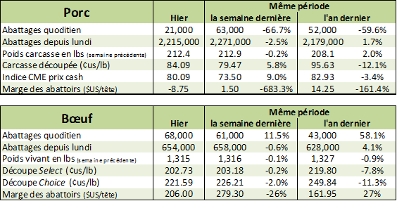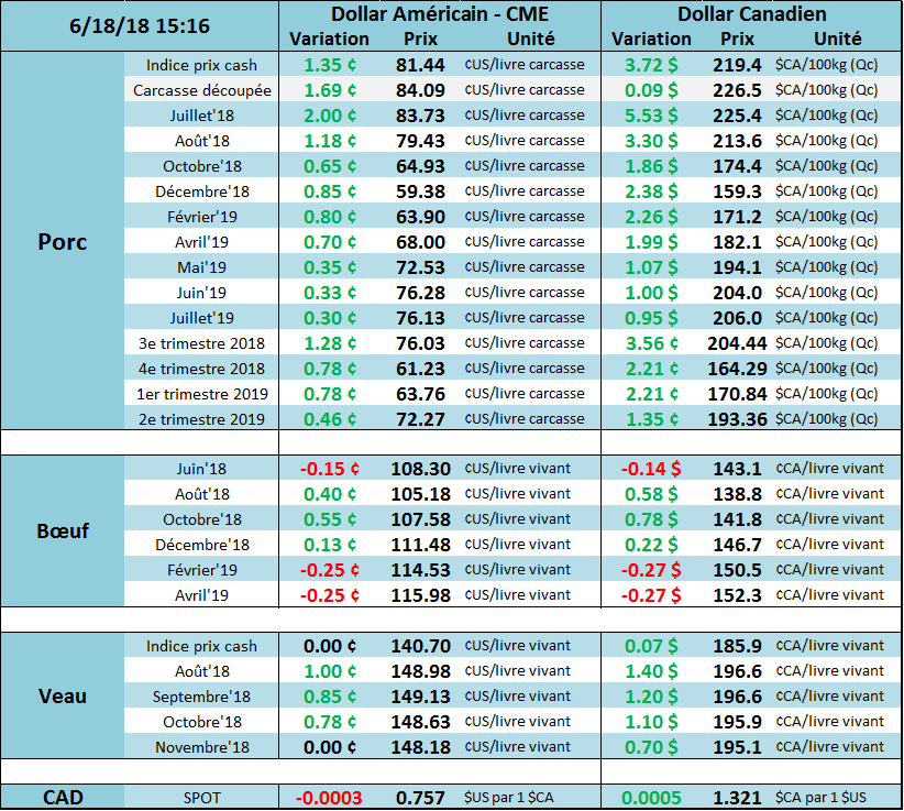 Vendredi dernier, l’USDA estimait que les abattages hebdomadaires étaient de 2.215 millions de têtes, en hausse de +1.7% par rapport à l’an dernier. Il s’agit également d’une baisse de 56 000 têtes comparativement à la semaine précédente. Le poids des carcasses, à 212.4 livres, continue de demeurer 2% au-dessus de la moyenne saisonnière des 5 dernières années. Une bonne nouvelle est que le poids par bêtes continue à diminuer et que les abattages ont ralentis. Mises ensemble, la production de la semaine dernière était en hausse de +3.8% comparativement à 2017, mais en baisse de -2.7% par rapport à la semaine précédente.