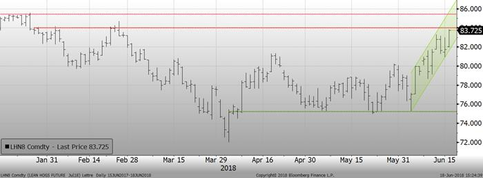 Pour l’instant, le prix du porc sur juillet continue sa tendance haussière et termine la séance d’aujourd’hui avec un gain de +2¢/lb ce qui permet au prix d’atteindre le plus haut sommet depuis la fin février à 83.82¢. Les prochaines résistances sont assez proches, à 84.00 ¢ et ensuite, ce sont les hauts de l’hiver dernier à 85.50 ¢/lb. Fort possiblement que le contrat de juillet peut continuer à s’apprécier, tout cela dépendra du moment où le prix cashralentira. Pour l’instant, ce n’est pas le cas avec un gain de +1.23¢ pour la journée de vendredi, avec un prix cash à 83.48¢ (indice CME à 82.86 demain matin, +1.42). L’an dernier, le cash avait plafonné à 92¢ à la mi-juillet ce qui a permis au contrat de juillet 2017 d’expirer à 92.60¢… le prix du CàT de juillet 2018 semble avoir la même trajectoire depuis quelques jours, on est au même prix que juillet 2017 à cette période de l’année… reste à voir jusqu’où ça ira!