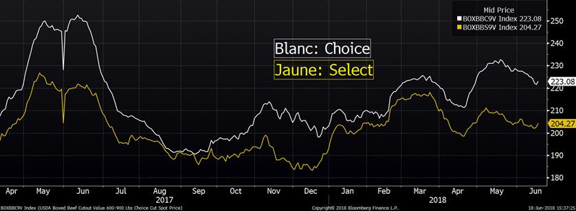 L’USDA estimait que les abattages étaient de 654 000 têtes la semaine dernière, une baisse de 4 000 têtes (-0.6%) comparativement à la semaine précédente et en hausse de +2.3% par rapport à 2017. Aujourd’hui, le prix des découpes était publié à 223.08¢/lb dans le Choice et à 204.27¢/lb dans le Select, un niveau légèrement inférieur à la moyenne historique des 5 dernières années.