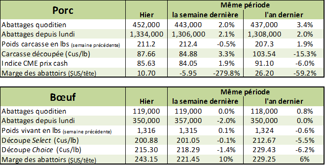 En ce qui concerne le cheptel commercial, on parle d’un troupeau de 67.13 millions têtes comparativement à 64.9 millions l’an dernier, soit une augmentation de 3.4% versus des attentes de +3.0%. En ce qui a trait aux plus gros porcs (180 lbs et +), il n’y en a moindre que prévu ce qui se reflète dans les chiffres d’abattages des dernières semaines. À 12.16 millions de porcs de 180 lbs et plus, la production de juin devrait tourner à +2.4% de croissance (moyenne de +2.5% ces 3 dernières semaines)… c’est cohérent! Parlons de ce qui s’en vient maintenant… La production pour les 5 semaines à venir (juillet à début août) correspond au troupeau de 120 à 179 lbs qui est de 14.20 millions têtes, en hausse de +4.0% versus des attentes à +3.0%. Pour la classe de poids de 50 à 119 lbs (production d’août et septembre), il y a 19.39 millions de jeunes porcs ce qui représente une croissance de 3.5% (estimés à +3.1%). Pour les plus jeunes porcelets, à 50lbs et moins, il y en a 21.4 millions ce qui est 3.6% de plus que l’an dernier et est également au-dessus des attentes. Les 3 classes des poids de moins de 180 lbs sont au-dessus de la fourchette des prévisions ce qui démontre à quel point l’offre de porc à venir est largement plus qu’anticipée… cela devrait être négatif pour les prix.