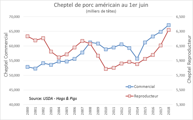 L’USDA a publié son rapport trimestriel sur le cheptel de porc au 1er juin et ce n’est pas positif pour les prix du porc à moyen – long terme. Il ne faut pas oublier le contexte actuel : le prix des grains est faible depuis plusieurs années et l’arrivée de nouveaux abattoirs aux É.-U. semblent avoir motivé plusieurs éleveurs à grossir leur troupeau.