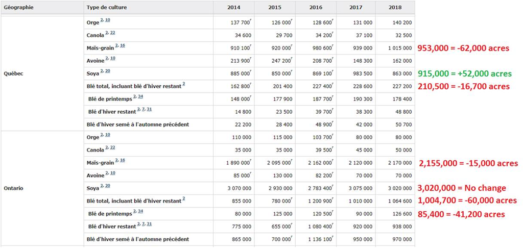 Au Québec, la superficie ensemencée en soya a diminué de 7,0 % par rapport à 2017 pour s'établir à 915 000 acres. Les agriculteurs de la Saskatchewan ont aussi déclaré un moins grand nombre d'acres ensemencés, soit 407 500, une baisse de 52,1 % par rapport à l'an dernier.