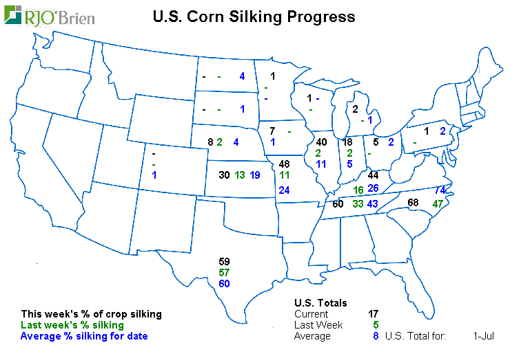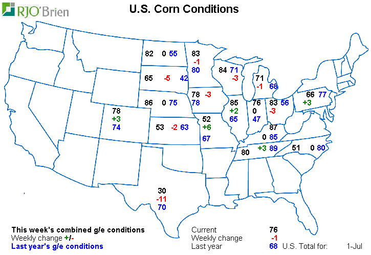 - Condition du maïs américain : 76% bon/excellent vs 76% attendu (75-77% fourchette), 77% semaine dernière, 68% l’an dernier (+2% dans « excellent » / -3% dans « bon »)