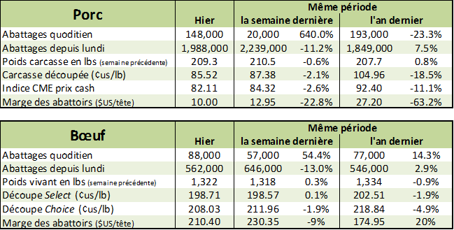 Le bœuf d’août clôturait inchangé vendredi, à 106.38¢/lb. Les mois d’octobre et de décembre perdaient -0.50¢/lb et -0.57¢/lb respectivement. Vendredi, le prix des découpes était en baisse de -0.40¢/lb dans le Choice et pratiquement inchangé dans le Select. En une semaine, le prix des découpe a perdu près de -5.20¢/lb alors que le 4 juillet et ses hauts saisonniers sont maintenant derrière nous. Les négociations au Texas se concluaient entre 112-113¢/lb la semaine dernière, légèrement en hausse par rapport à la semaine précédente. Aujourd’hui, le prix faiblit sur les mois d’octobre, décembre et février, fort possiblement en raison de la compétition qu’aura à affronter le bœuf face à l’abondance de porc suite à l’augmentation des taxes.