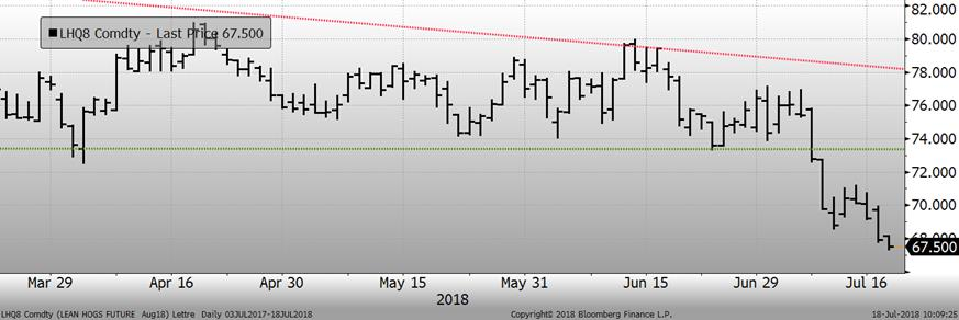 Techniquement, le porc d’août pourrait bien être survendu à 67.40¢/lb puisque le marché semble avoir déjà avoir absorbé la baisse du prix cash à venir. Ce matin, l’indice CME du prix cash sera publié à 79.69¢/lb, une baisse de -1.98¢/lb par rapport à la semaine dernière. Au prix actuel, le contrat à terme d’août se négocie à 11-12¢/lb d’escompte par rapport au prix cash ce qui représente un écart historiquement record, mais exæquo avec l’an dernier. Néanmoins, l’an dernier, les prix n’étaient pas dans une tendance baissière comme c’est le cas cette année et le contrat d’août 2017 avait expiré à 84.45¢/lb, dans le haut du contrat. La situation est similaire pour les autres mois à venir, avec octobre se négociant à près de 28¢/lb d’escompte par rapport au prix cash alors que la moyenne des 5 dernières années est de 17-18¢/lb. Ce 10¢ de plus que la moyenne reflète amplement le risque que les États-Unis perdent des ventes suite aux tarifs, mais le marché semble toujours être en mode « panique ».