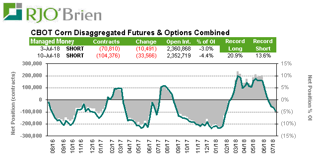 1. Les fonds ont passé d’un net long à un net court en seulement 4 semaines, autant dans le corn que dans le soja. Toujours possible d’ajouter un peu, mais aux niveaux de prix actuel l’augmentation des positions de vente risque d’être plus limité. Aussi, on pourrait commencer à voir des prises de profits ou même un renversement si jamais le fondamental/technique le suggère.