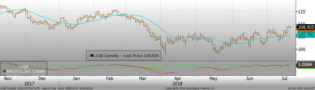 Le rapport Cattle on Feed publié aujourd’hui par l’USDA n’apporte pas grand surprise. L’USDA publiait des placements légèrement supérieurs aux estimés, à +1.3% versus 2017, comparativement à +0.9% attendu par les analystes ce qui légèrement négatif pour le marché. Les mises en marchés étaient en ligne avec les attentes, en hausse de +0.9% versus juin l’an dernier. Mise ensemble, les inventaires en parc étaient en hausse de +4.3% par rapport à juin 2017, pour un total de 11.28 millions de têtes en parc au 1er juillet 2018. La hausse est en majorité expliquée par la hausse du nombre de bêtes en parc depuis plus de 90 jours, ce qui pèse sur l’offre à court terme.
