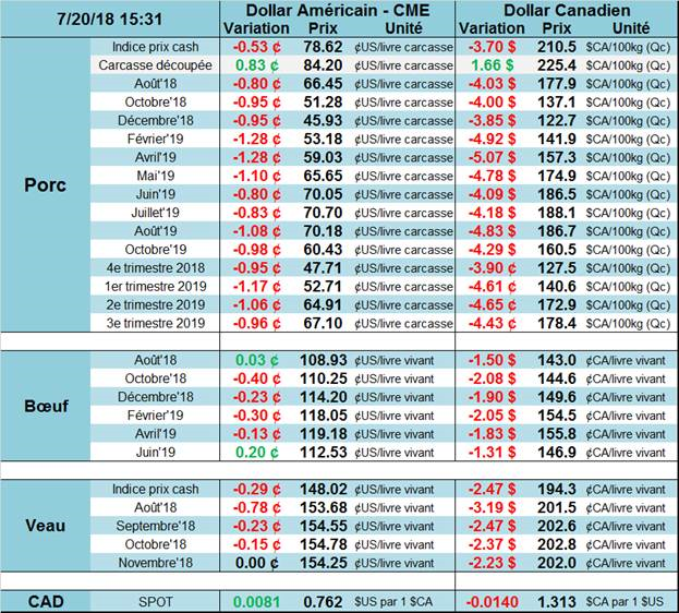 L’USDA estimait que les abattages étaient de 121 000 têtes hier, amenant le total de la semaine à 476 000 têtes. Il s’agit d’une hausse de +4.2% versus 2017. Hier, les ventes à l’exportation américaines publiées pour la semaine du 12 juillet étaient en baisse, à 13 518 tonnes, comparativement à 16 074 tonnes pour la moyenne des 4 dernières semaines. Il s’agissait tout de même d’un niveau supérieur aux 4 dernières années.