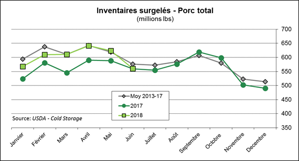 Selon le dernier rapport sur les inventaires surgelés, il y avait 560 millions lbs de porc au 30 juin ce qui est exactement comme l’an dernier. Les inventaires de flanc sont particulièrement élevés comparativement à l’an dernier (+130% versus 2017), mais il s’agit d’une comparaison favorisée par des inventaires anormalement faibles l’an dernier. Il n’est pas surprenant de voir les inventaires diminuer au même niveau que l’an dernier puisque les acheteurs chinois et mexicains ont possiblement acheté beaucoup de volume avant l’application des tarifs douaniers au début juillet. Ce qui sera particulièrement intéressant sera de constater l’impact des tarifs douaniers lors du prochain rapport dans 1 mois.
