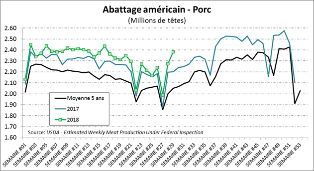Cette semaine, l’USDA estimait que les abattages étaient de 635 000 têtes la semaine dernière, une hausse de +2.8% ou 17 000 têtes par rapport à 2017. Avec un poids moyen légèrement inférieur à l’an dernier, la production était en hausse de +2.5% versus 2017.