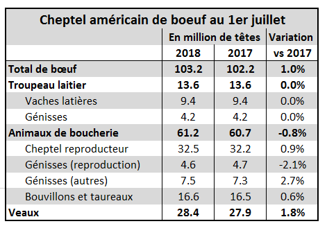Dans son rapport sur l’inventaire de bœuf au 1er juillet, l’USDA publiait que la progression du troupeau laitier était inchangée, tandis que le troupeau de bœuf augmentait de +0.8%. Les génisses destinées au cheptel reproducteur étaient en baisse de -2.1% comparativement à l’an dernier. Les génisses destinées au parc étaient en hausse de +2.7% et les bouvillons étaient en hausse de +0.6%. Dans l’ensemble, il s’agit d’une bonne nouvelle pour le prix puisqu’il y a moins de génisses retenues pour le cheptel reproducteur. Cela devrait maintenir la taille du cheptel reproducteur et ultimement limiter les naissances. Selon le rapport, l’offre de bœuf ne devrait pas trop augmenter pour la saison de mise en marché 2019-2020.