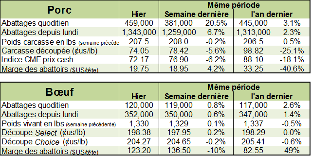 En effet, le porc a tellement baissé que les acheteurs pourraient bien être au rendez-vous dans les prochaines semaines. Hier les CàT pour l’ensemble des mois étaient négatifs : août -1.27¢/lb, octobre -1.12¢/lb, décembre -1.12¢/lb, février -0.82¢/lb. À 45.18¢/lb, il est difficile de dire que le porc de décembre n’est pas une aubaine. La réalité, c’est que le porc cash ne s’est pas transigé en dessous de 43.5¢ à mi-décembre depuis 1998 et c’était la seule fois! Cependant, la tendance demeure baissière et il n’est pas dit que le prix ne pourrait pas en perdre un peu plus au cours des prochaines semaines… donc, les acheteurs sont toujours omniprésents sur les marchés.