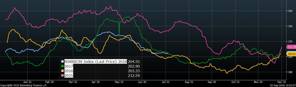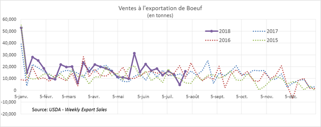 Hier, l’USDA publiait de bonnes ventes à l’exportation, à 16,159 tonnes. Il s’agit davantage d’un rebond, car les ventes publiées la semaine précédente était au plus bas volume hebdomadaire de l’année, à seulement 4,738 tonnes. Depuis le début de l’année, les exportations nettes de bœufs ont aidé à supporter la demande du bœuf américain avec des ventes à l’export en hausse de +18.7% comparativement à 2017. Si cette situation perdure, les prix pourraient bien se maintenir malgré la hausse de production attendue au 3e trimestre.