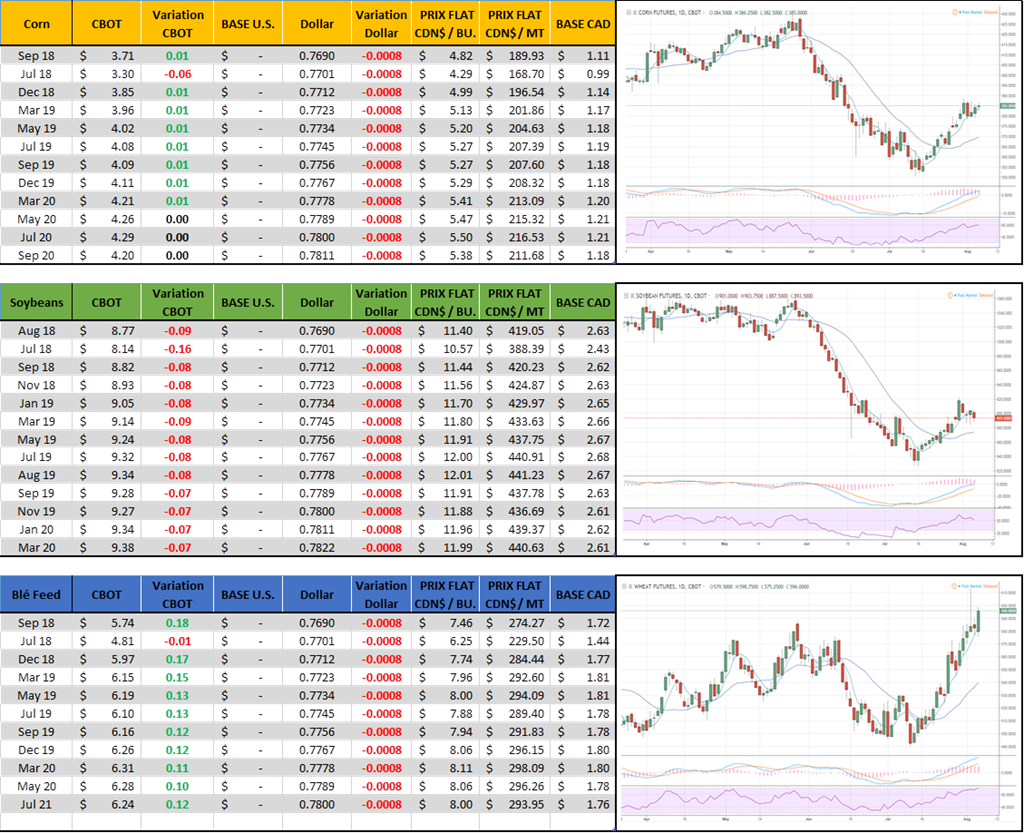 Coté météo on voit quelque endroits où il faudrait de l’eau possiblement d’autre secteur qui ont connu des températures élevés pourrait avoir eu des problèmes au moment de la pollinisation. L’USDA jettera un premier coup d’œil au rendement dans son rapport vendredi midi. En ce moment les perspectives de rendement sont extrêmement bonnes encore, mais entre courtier nous nous disons qu’elles ont baissées légèrement depuis une semaine au deux. Les discussions autour de 180 et plus boisseaux à l’acre dans le maïs sont un peu plus rare et nous entendons plus de conversations et projections autour du 175-177 BPA. L’an passé a été un record à 176BPA donc comme je disais les rendements cette année sont toujours prévu pour être excellent, s’agit de savoir à quel point et aussi comment la saison va se terminer… est-ce que le mois d’aout sera décevant coté météo/pluie et aussi est-ce que septembre et l’automne s’étirera pour aller cherche un ou deux boisseaux à l’acre de plus/moins. Rajouter mon meilleur ami Donald dans le bouillon est la sauce pour changer de gout rapidement, qui sait.